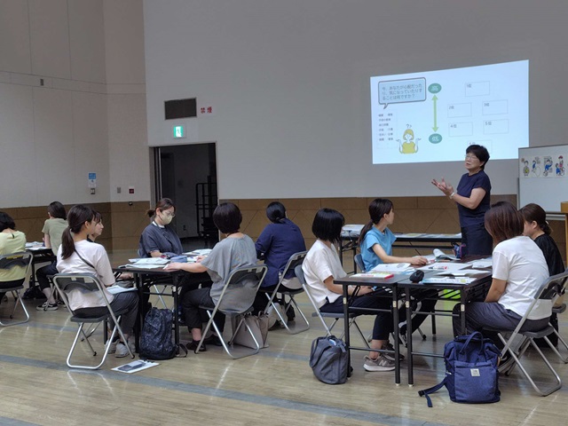 グループワークでは日常の保育でも声かけの工夫などで取り入れることができることがないか皆さんと話し合いました。