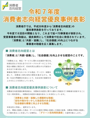 令和7年8月8日、消費者庁が「令和7年度消費者志向経営優良事例表彰」の募集を開始しました。 詳細は消費者庁ホームページでご確認ください。 皆さんのご応募をお待ちしています。