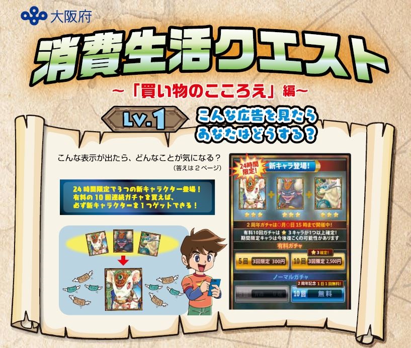 消費生活啓発資料としてスマホで閲覧できるWebマンガ。ミステリー仕立ての本編と、スピンオフとして消費生活・ネット関係の8つのトラブルを紹介する短編がある。本編では、「マルチ商法」などを題材に、楽しみながら消費生活上の知識が身につく。日本オンラインゲーム協会とコラボして作成し、京都府消費生活安全センターのWebサイトに掲載中。今後、短編マンガを冊子として発行し、成年年齢引き下げに対応した、若年層対象の啓発資料として活用予定。