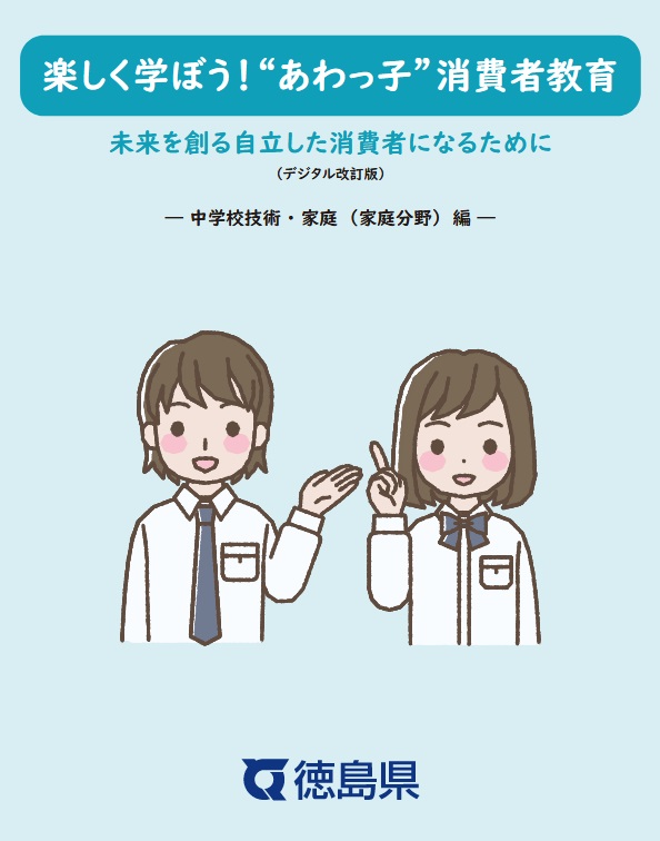 中学生向け消費者教育教材として、「契約の知識や契約に伴う責任」「消費者被害の事例や対応方法」「生活にかかるお金や計画的な金銭管理」などが盛り込まれた冊子教材(A4サイズ52ぺージ)。新学習指導要領に準拠した内容構成で、技術・家庭科で活用できる。「教師用」と「生徒用」が別冊で作成され、教師用冊子には、「教師用手引き」を掲載し、ワークシートはデータ化されている。生徒用冊子は徳島県のホームページからもPDFファイルでダウンロードが可能。徳島県の取組の食品ロス削減、コウノトリと育む持続可能な社会、高校生によるエシカル消費の推進の紹介が掲載。