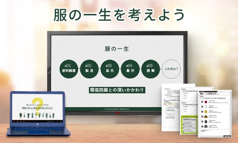 服を自ら選ぶ年代となる高校生に向けて、身近な衣服と環境問題の関係に気付き、環境負荷を低減する行動について考えるきっかけをつくる教材。授業用スライド・動画・ワークシートで構成され、ファッション業界の環境への影響、環境に配慮した衣服の選び方や企業の取組みについて学んだ後、ワークシートを使い、これからの衣服との向き合い方を提案してもらことができる。