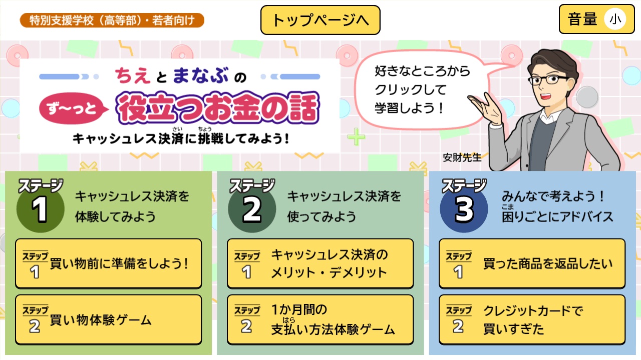 キャッシュレスをテーマにした特別支援学校の生徒を対象としたパワーポイント教材で、指導者用活用ガイド、ワークシートが用意されており、生徒の理解度に応じて必要な内容を抜粋して活用できるなど、教員によるカスタマイズも可能である。イラストデータは自由に使えるようWebで公開している。