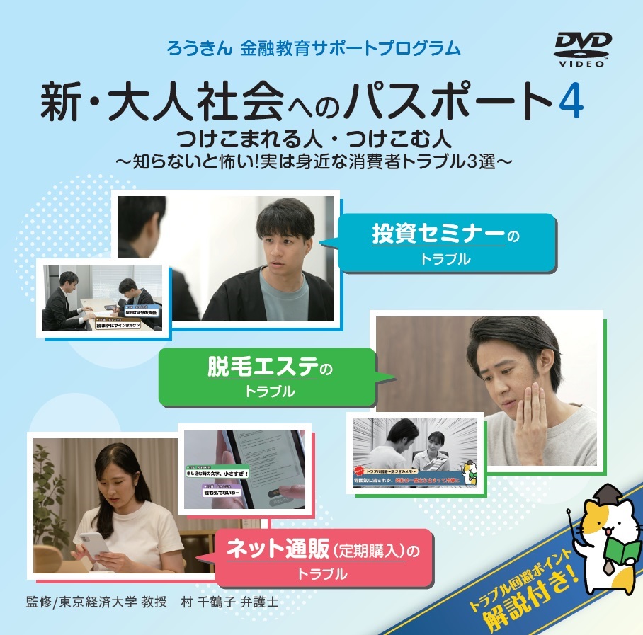 成年年齢引下げに向け、その概要と、若年者に多い4つの消費者トラブル(①オンラインゲーム課金トラブル、②マルチ商法、③デート商法、④美容系トラブル)の事例を取り上げたDVD教材(25分)で解説書が付いている。各事例が5分前後で、事例の最後にトラブルに遭わないための対策がコンパクトにまとめられている。各事例の対応方法や学習のポイントも記載したブックレットが付属。動画はWebサイトにて視聴可能。