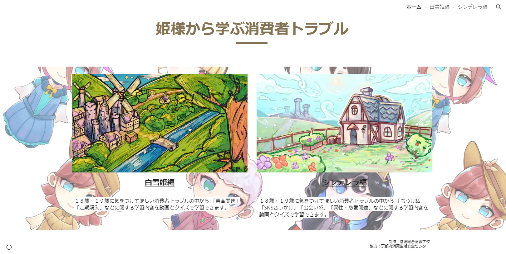 若者に多い消費者トラブルとその回避方法について学習できるWeb教材。地域の消費生活センターの協力のもと、高校生が制作した。Webサイトには「動画」や「クイズ」、振り返りに活用できる「ワークシート」が掲載されている。動画は『白雪姫編(美容・定期購入関連トラブル)』、『シンデレラ編(SNS・もうけ話)』の2編で構成され、トラブル事例に対して、予防・対処方法をコンパクトに学ぶことができる。対象は高校生以上である。