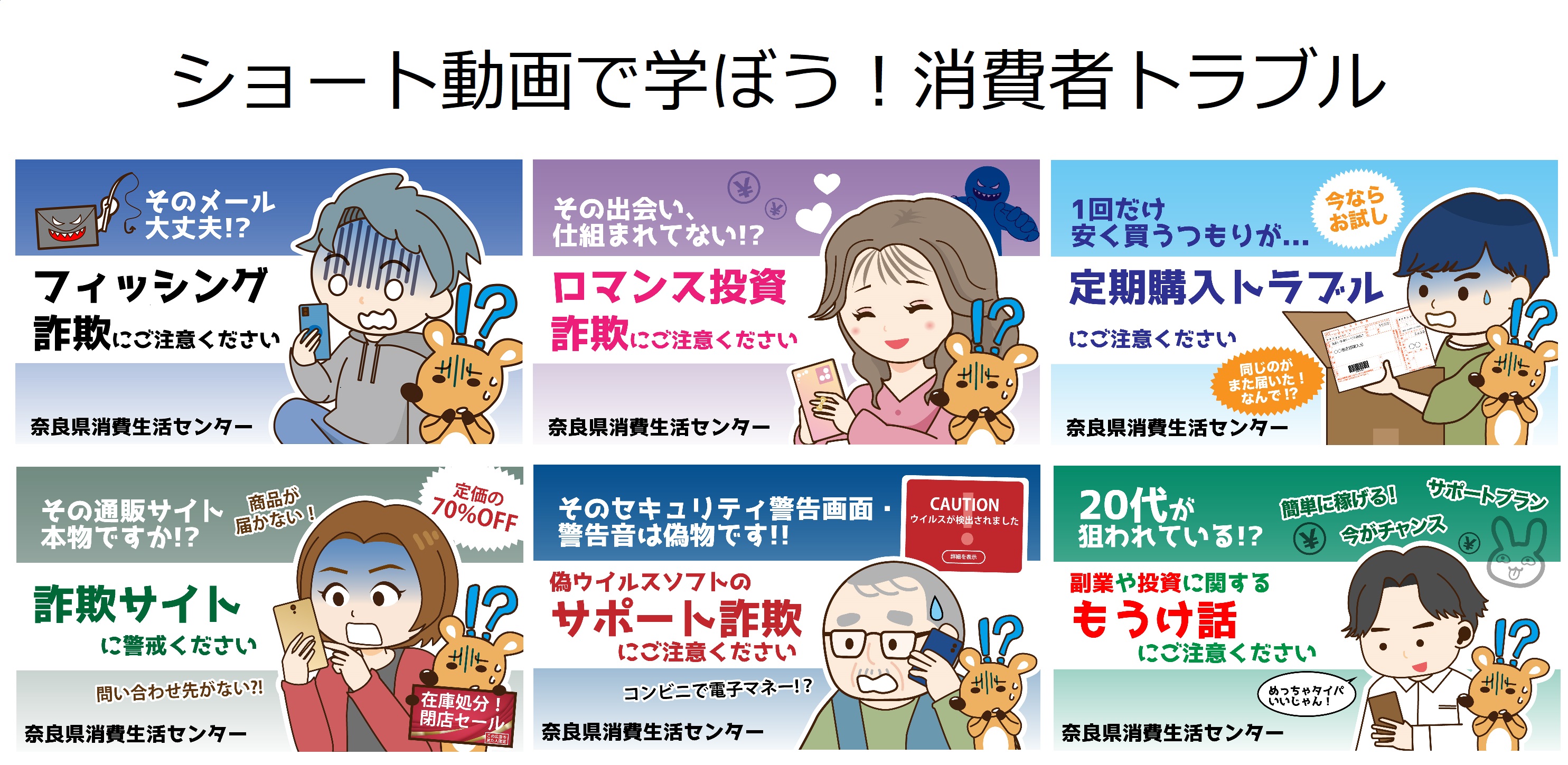 消費生活センターの紹介動画に加えて、6つの相談事例(フィッシング詐欺、ロマンス詐欺、定期購入、詐欺サイト、偽ウィルスソフトのダウンロード、投資詐欺)を30秒~1分程度で紹介するアニメ動画。啓発イベントなどでの使用を想定し、短時間でトラブル事例と対応方法を伝える内容となっている。