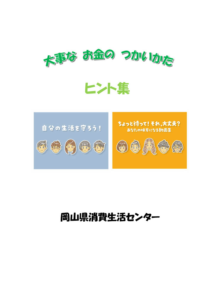 成年年齢引き下げに対応して新学習指導要領の小学校「家庭」、中学校「技術・家庭(家庭分野)の「C 消費生活・環境」で新設となる内容や、消費者市民社会などについて扱われている(A4サイズ36ページ)。新設内容に対応させて目次が色分けされ、学習指導要領のポイントがわかりやすく示されている。解説や参考資料、指導のための具体的事例、ロールプレイ台本、事業展開例などが掲載。山梨県のホームページからPDFファイルで教材やワークシート、スライド、イラスト集がダウンロード可能。