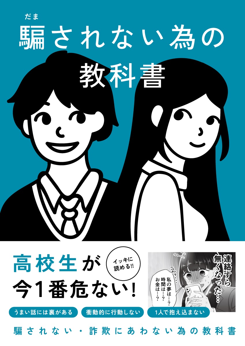成人年齢の引き下げを受け、「騙されない・詐欺被害に遭わない為の教科書」として作成された高校生対象の印刷教材。若者が被害に遭いやすい具体例(フィッシング詐欺、無料商法など)をマンガで紹介し、読み進めやすいように工夫されている。Webサイトからダウンロードが可能。