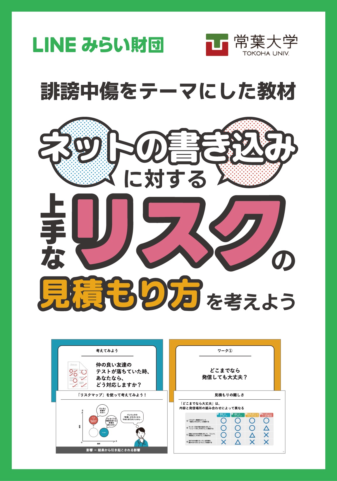 中高生を対象にしたスライド教材。①ネット上の発信リスクをグラデーションとして捉えさせる、②悪質な書き込み被害に対する投稿基準や対応の目安を考える、③加害者と被害者だけではなく、周囲の要因によるリスクの変化を踏まえた見積もり方を考える、から構成される。授業用スライド、生徒用ワークシート、講師用ガイドブックも用意されている。Webサイトからダウンロードが可能。