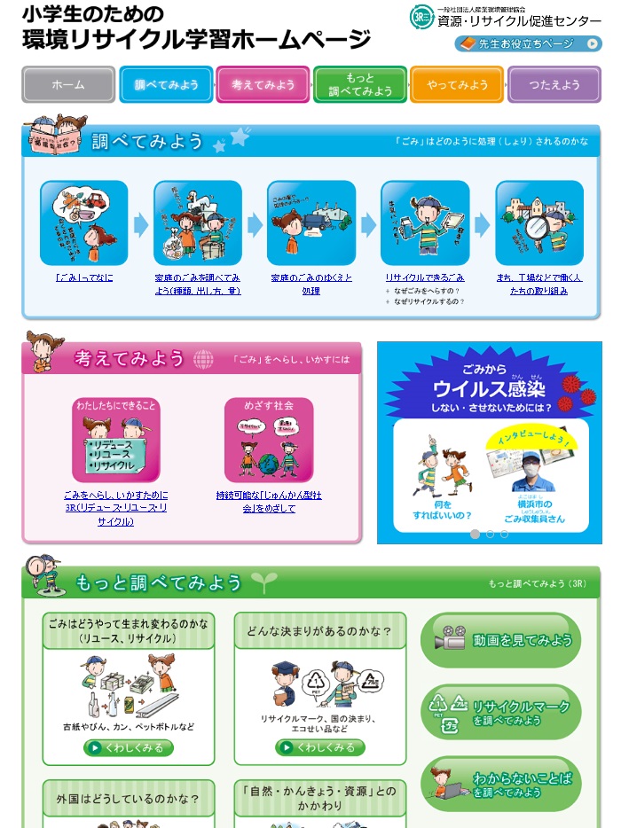 環境やリサイクルのつながり、循環型社会の仕組みを学べる小学生対象のWeb教材。リサイクルに関する基本的な情報が幅広く取り上げられ、いずれもイラスト等により分かりやすく学ぶことができる。身近なモノのライフサイクルをもとに、「調べる」「考える」「試す」「伝える」といったステップで構成されている。ワークシートや作品投稿の仕組みもあり、授業や家庭学習などさまざまな場面で活用できる。