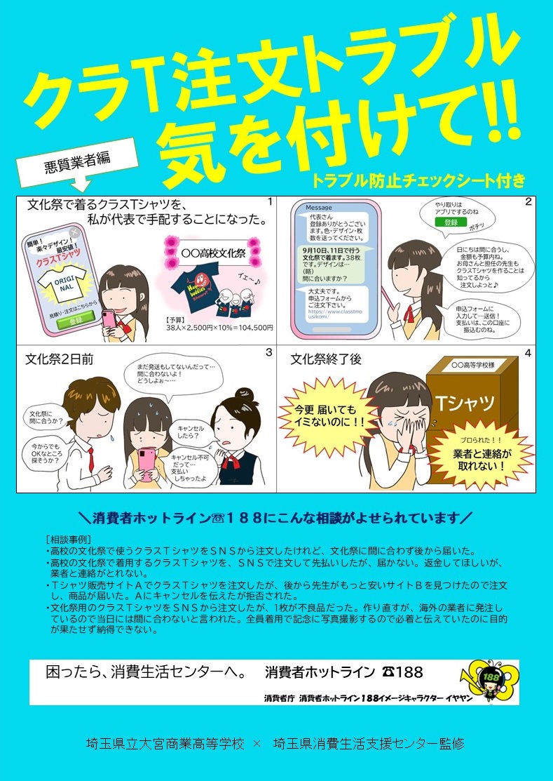 文化祭や体育祭で作成するクラスTシャツの購入トラブルをテーマにした高校生対象のリーフレット教材(A4二つ折り)。具体的なトラブル事例を紹介し、実際にクラスTシャツを注文する際に活用できる書き込み式のトラブル防止チェックシートが掲載され、実践的な内容となっている。