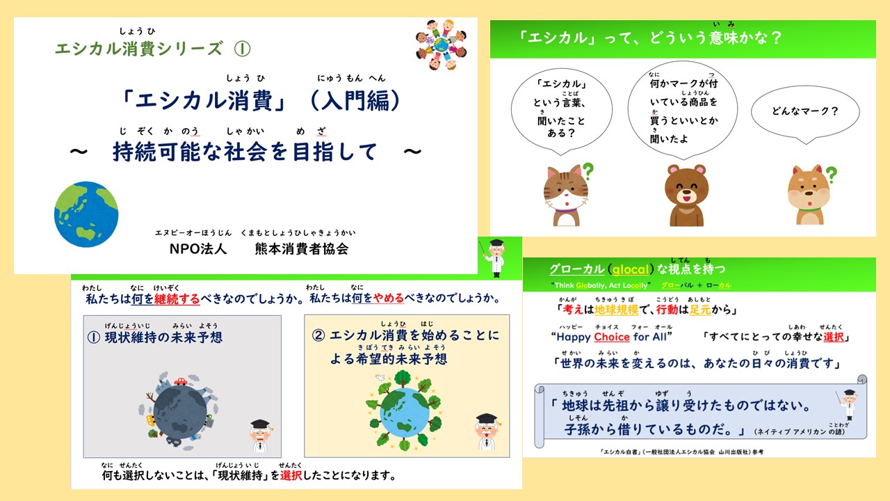 2022年(令和4年)消費者庁長官賞。「エシカル消費」について学ぶ小学校用の教材(A4、16ページ)をタブレット端末で活用できるようデジタルパンフレットとして作成。ワークシート(A4、13シート)と、教師用指導書(A4、10シート)もある。各レッスンの内容と関連した教科や学年が明示されていて、「エシカル消費」を児童が身近な問題として考えながら学べるようにすると共にタブレット端末を家庭に持ち帰って活用できるようにもしている。Webサイトからのダウンロード可能。