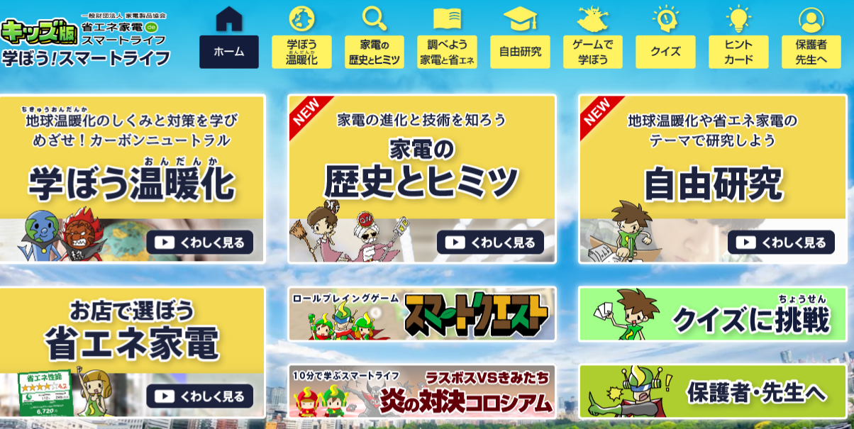 小学生を対象に地球温暖化、省エネ、家電製品の技術などについて学べるWebサイト。「学ぼう温暖化」「調べよう家電と省エネ」などのコンテンツ、自由研究やゲームなどがある。環境問題の調べ学習や授業の副教材として活用が可能。