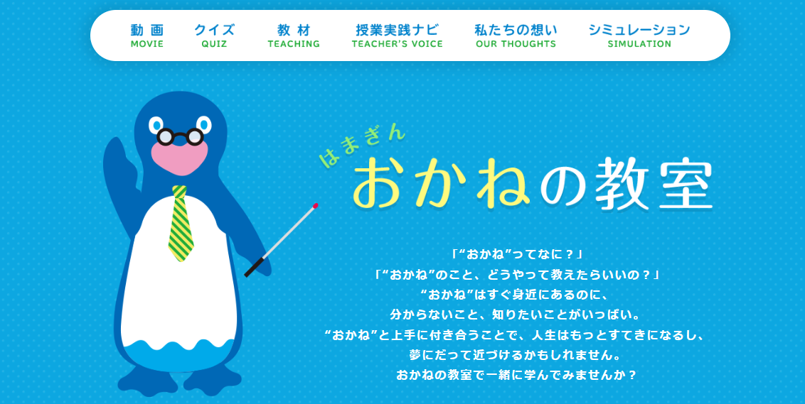 “おかね”について学ぶアニメーション動画に加え、ワークシートや指導案が掲載されている。Webサイトには、クイズやシミュレーション、実践例など金融教育の基礎について学ぶことができるコンテンツも含まれている。