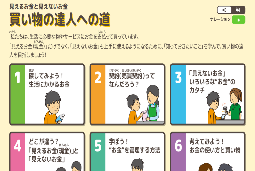 クイズや疑似体験を通して買い物の仕組みやお金の管理方法などを学ぶことができる。説明字幕にはルビがふられており、音声ナレーションも用意されている。
